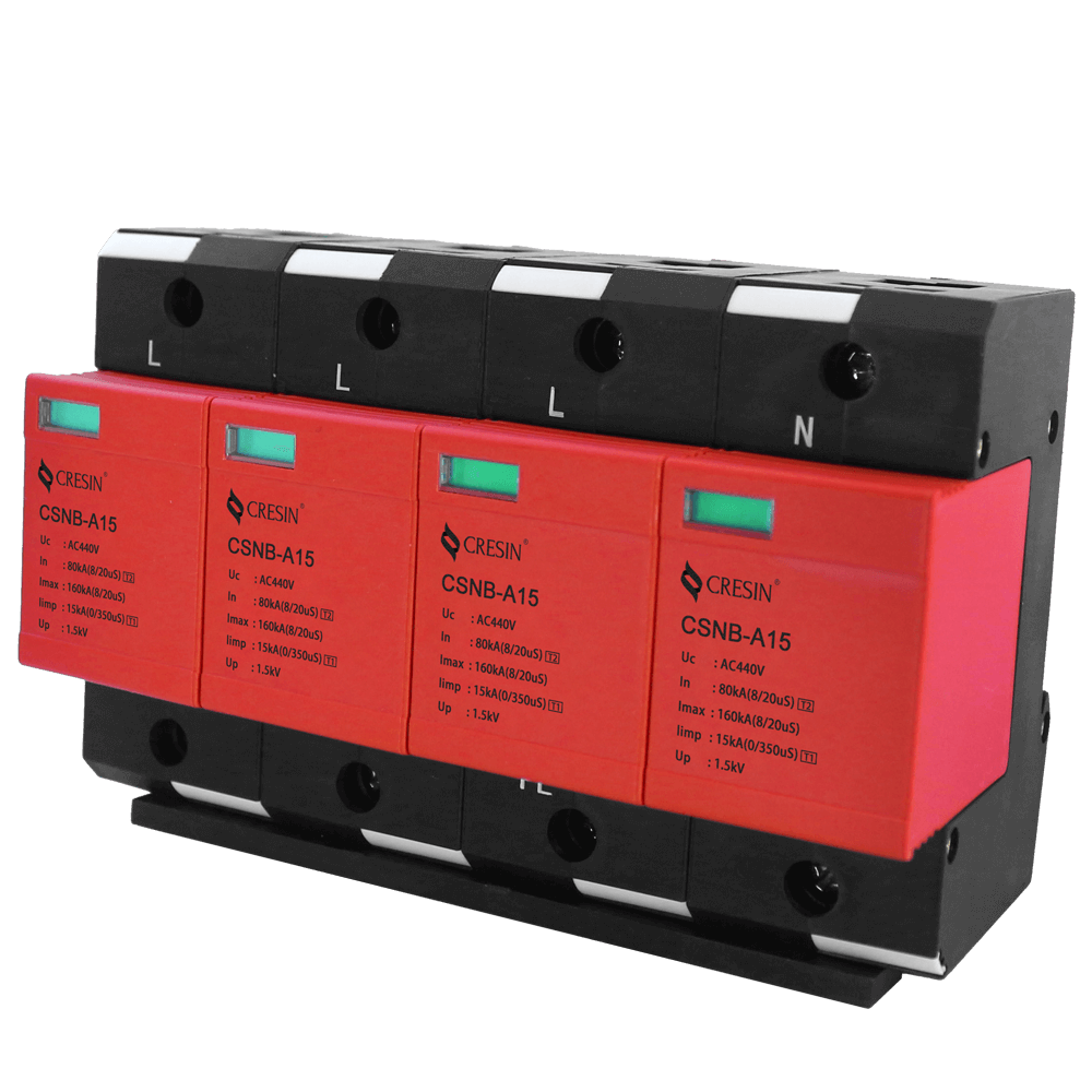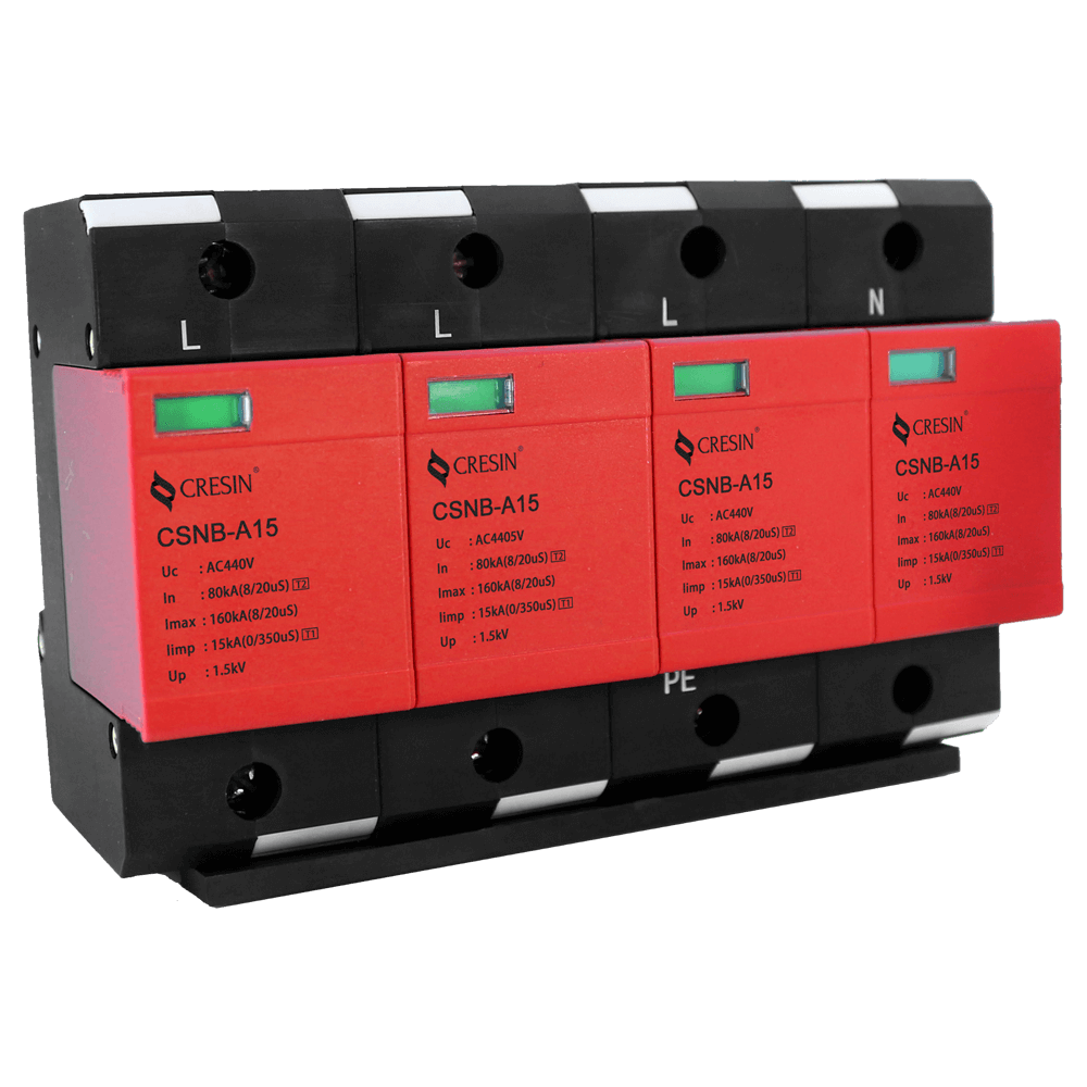 CSNB-A15 系列保護(hù)器(電涌保護(hù)器)是依據(jù) GB18802.1、IEC61643-1 防雷標(biāo)準(zhǔn)設(shè)計(jì),適用交流 50Hz,220v/380v 及以下的 TN-S、TN-C-S、TT、IT 等供電系統(tǒng),標(biāo)稱(chēng)放電電流 In 達(dá)到 50 kA(8/20μs),最大泄放電流 Imax 達(dá)到 100kA(8/20μs),沖擊放電電流 Iimp 達(dá)到 15kA(10/350μs),通過(guò)國(guó)家專(zhuān)業(yè)檢測(cè)機(jī)構(gòu)的雷電防護(hù) I 類(lèi)試驗(yàn),適用于雷擊風(fēng)險(xiǎn)較高地區(qū)(LPZ0B 或 LPZ0B 與 LPZ1 交界區(qū)),應(yīng)用于交流電源