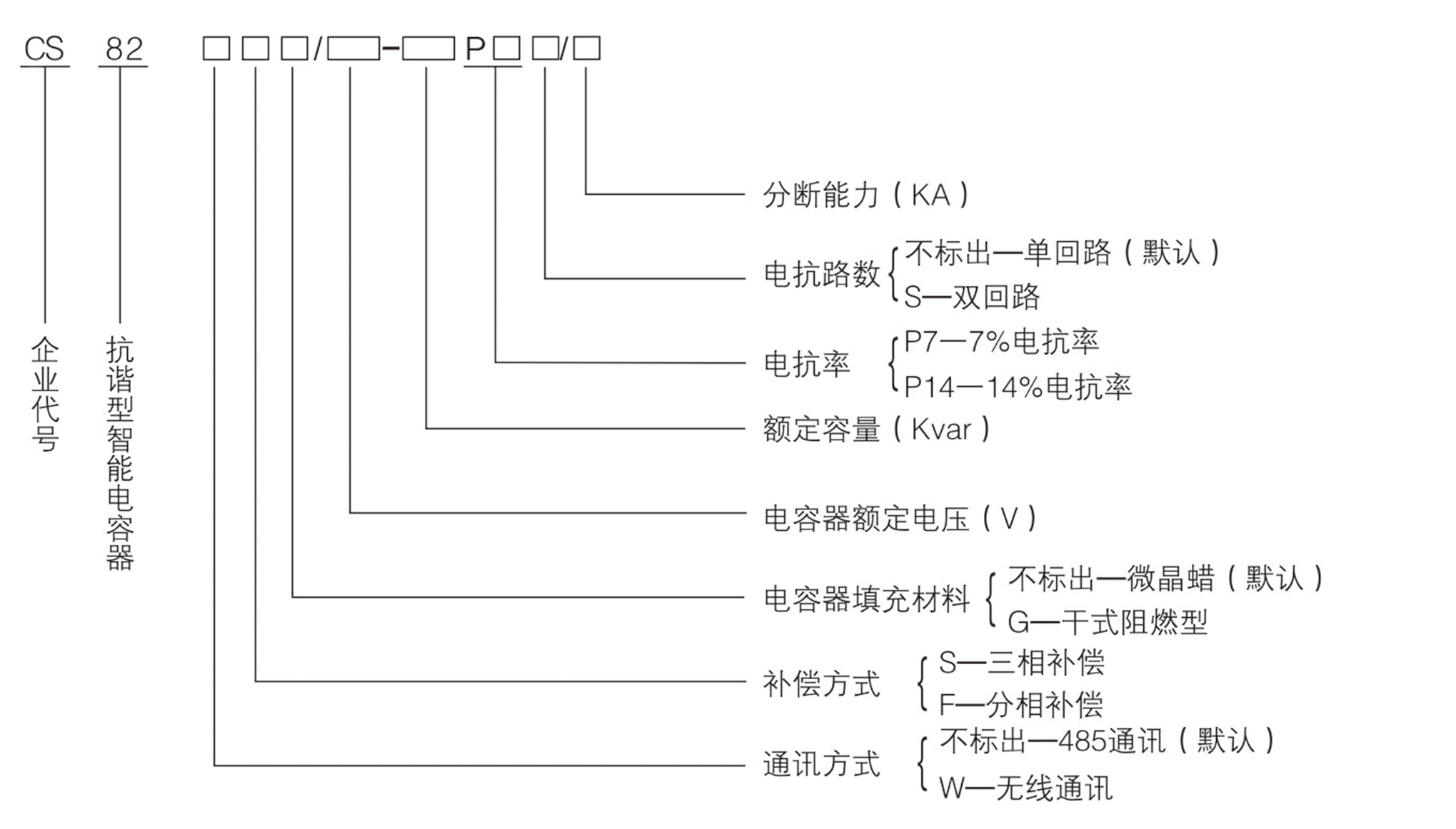 示例:CS82SG/525-40P14/6,表示三相共補抗諧型單電抗干式低壓智能電力電容器,通訊方式為RS485,額定電壓525V,額定容量40Kvar,電抗率14%,斷路器分斷能力為6KA。